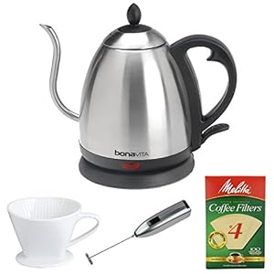 Finally an affordable kettle for manual pourover brewing! With the very same stunning design and excellent development as the Bonavita non-electric Gooseneck Pour Above Kettle, this electric variation pairs properly with one particular cup pourover brewers, much larger Chemex brewers, and every other handbook brewer we have thrown at it. Tremendous uncomplicated to use, basically fill with water, set the kettle on the foundation, then depress the lever. After the pot reaches boiling it quickly shuts off. Heats h2o to boiling really promptly, all-around four-5 minutes. We have located that the lid layout enables for a frothing thermometer to conveniently be attached so you know precisely what temperature you are brewing at. Bundle Involves: • Bonavita BV3825B 1.0 Liter Electric Gooseneck Stainless Kettle • Porcelain Espresso Filter Cone Dimensions 4 • Melitta Pure Brown Basket Coffee Filter, #4 - a hundred Depend • Knox Handheld Milk Frother